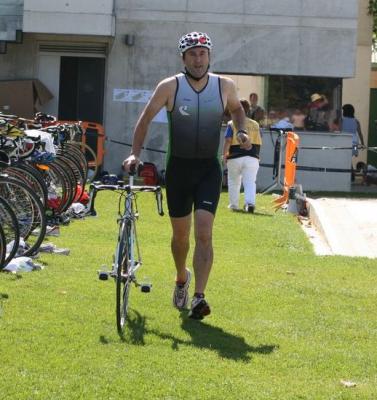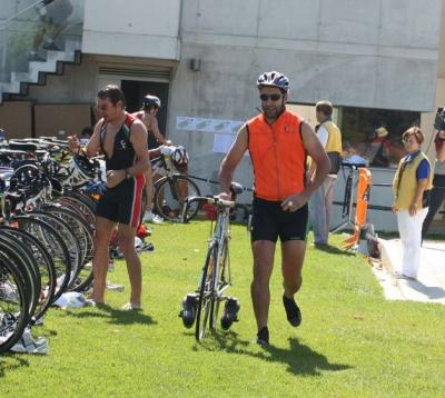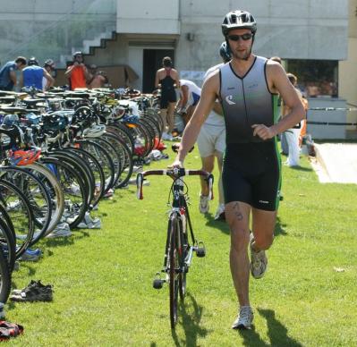 Urko en la transición preparándose para comenzar la prueba en bici.